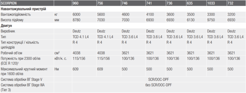 4-циліндрові високопродуктивні двигуни Deutz із 4 клапанами і турбонаддувом забезпечують потужність 100 кВт (136 к. с.). Моделі SCORPION 960 і 756 оснащені агрегатом потужністю 115 кВт (156 к. с.). Обидва варіанти двигунів завжди мають достатній запас потужності, навіть під час важких робіт зі штовхання або перевалки. Інтелектуальна система керування двигуном у поєднанні з функцією SMART ROADING завжди підтримує двигун в оптимальному діапазоні частоти обертання та крутного моменту. Таким чином ви значно зменшуєте витрати пального.