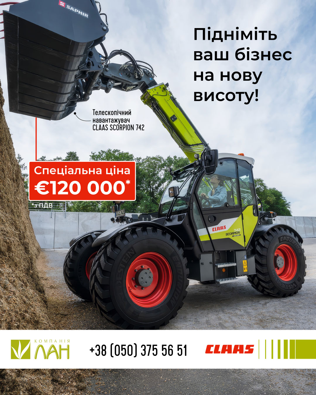 Цієї весни українські аграрії мають унікальну нагоду придбати сучасний телескопічний навантажувач CLAAS SCORPION 742 на вигідних умовах. Офіційний дилер техніки CLAAS — Компанія ЛАН — оголосив спеціальну ціну на машину: всього 120 000 євро з ПДВ.